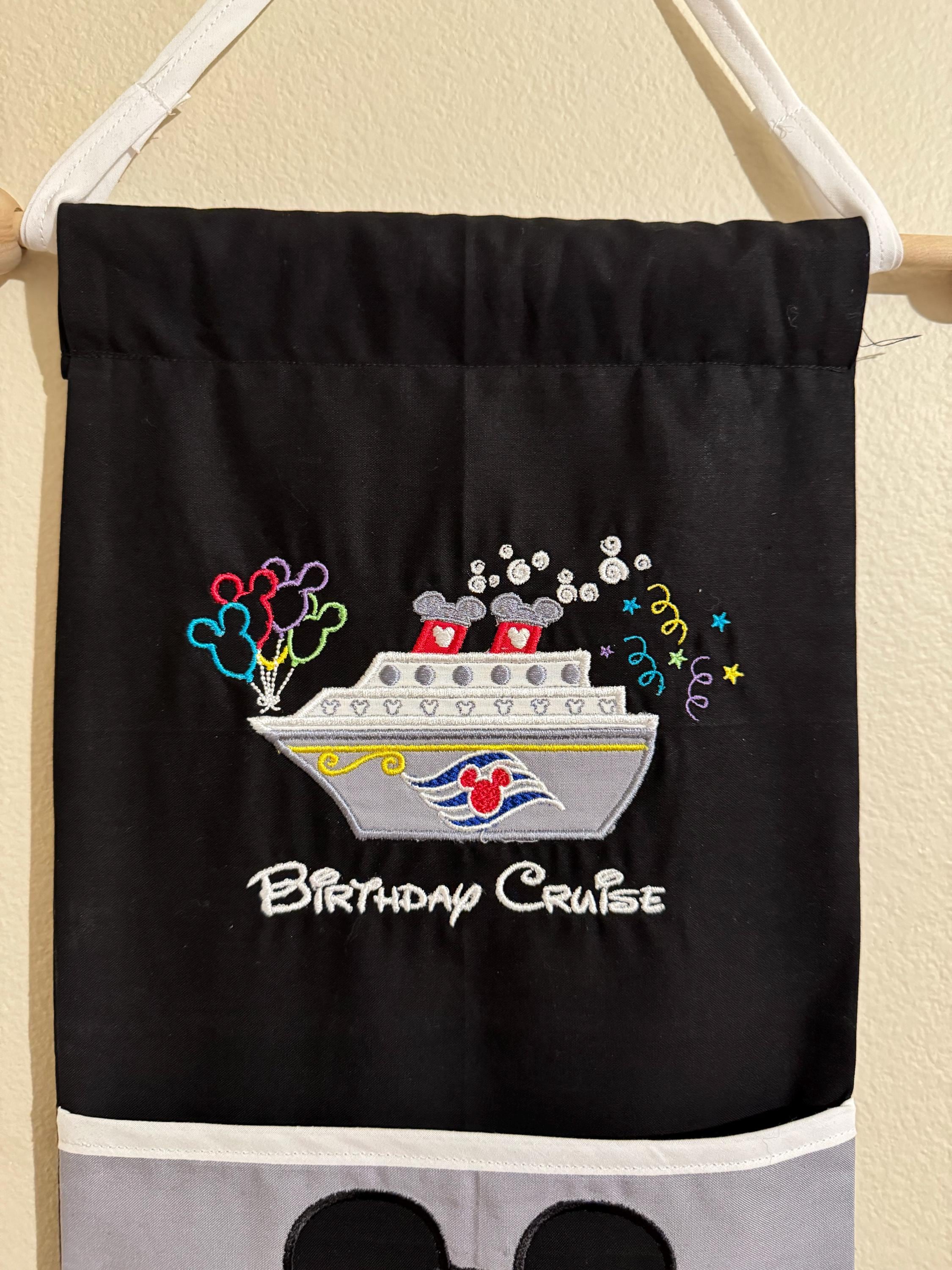 This listing is to add the cruise ship design shown in the picture to the header of your completed fish extender where your family name or saying is placed. The Cruisin with Mickey wording will not be included unless indicated on your order. The color of the hanger will match the color of the trim on the pockets of your fish extender. The color of the ship will be gray on a black background. If you would like the ship to be a different color, please indicate that in the notes to the seller at checkout.